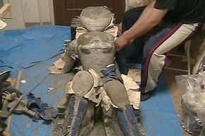 ラブドールにモルタルを詰めて成型した像を公園に置く様子を逆回しした映像
