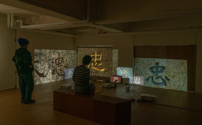 An installation using video footage of stone monuments and the character “zhong” (loyalty) written in stone monuments and public signs in Taipei, Taiwan.
