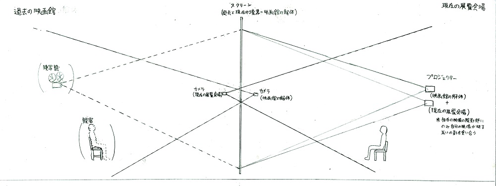 映写機、プロジェクターは暗い面に光の束を投射してその反射光を見ることで映像を視認することができる装置である。投影面が暗いことが映像を観る条件である。このインスタレーションでは二台のプロジェクターから同じ面に向けて光を投射するので、一方の映像の中の暗い部分にのみ、他方の映像の明るい部分が現れる。過去の劇場内の影の部分に、現在の展示会場の鑑賞者が映りこむ。逆に、暗くセッティングされた現在の展示会場の背景部分に、過去の劇場の外からもれ入る光が映し出される。過去の光と現在の光が、お互いの影を食い合う。お互いの影をお互いの光が侵食する形で視認できる劇場と鑑賞者の共存が、劇場が徐々に解体され明るくなるにつれてどのような終わりを迎えるのかは、実際の鑑賞者となって一見していただきたい。